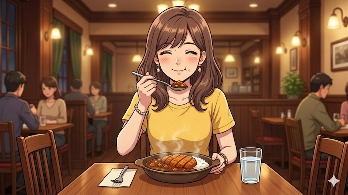 「私は美味しいカツカレーを食べています」